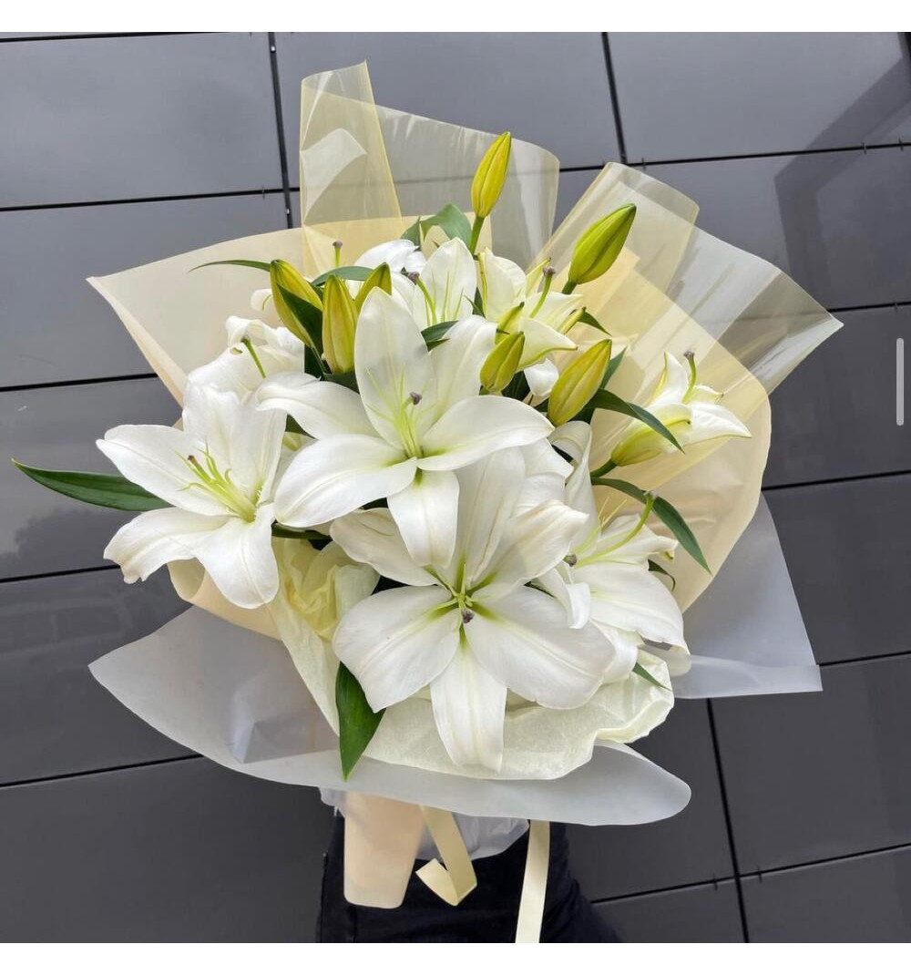 Элегантный букет из 9 лилий создает неповторимую атмосферу изысканности и изящества. Каждая лилия - это символ чистоты, красоты и возвышенности. Их утонченный аромат наполнит комнату нежными нотками, принося радость и умиротворение. Этот букет идеально подходит для поздравлений, выражения благодарности или просто чтобы подарить радость вашим близким.